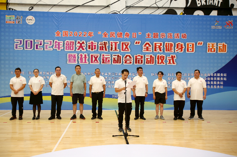 8月7日上午,由国家体育总局群体司、中华全国体育总会群体部、韶关市文化广电旅游体育局、韶关市武江区文化旅游体育局共同主办的“全国2022年“全民健身日”主题示范活动”2022年韶关市武江区“全民健身日”活动暨社区运动会启动仪式在武江区碧水花城文体中心举行,近600名社区居民线下参与此次活动;武江区委常委、副区长房仲斌出席运动会启动仪式,区文旅体局、新华街道办、惠民街道办、西河镇、西联镇等有关同志和嘉宾参加了启动仪式。