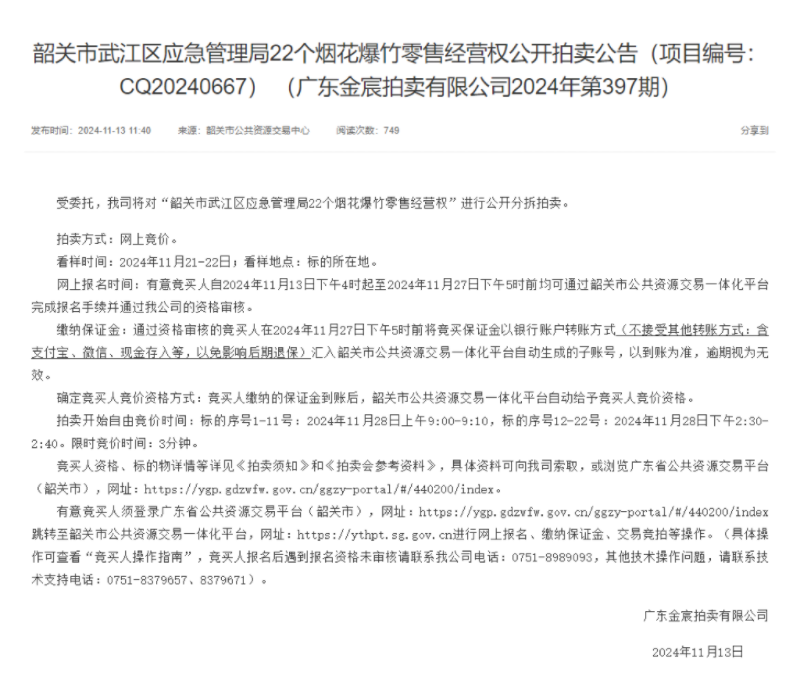 公开拍卖提升公平竞争。委托有资质的第三方机构在韶关市公共资源一体化平台进行烟花爆竹经营零售经营权公开拍卖,考虑到各乡镇人口分布情况、市场需求情况等因素,对不同的乡镇分别设置起拍价为3200元至6600元不等,使烟花爆竹经营权市场实现真正的“公开、公平、公正”。同时,为严控总量和削减存量,按照《武江区2025年烟花爆竹经营(零售)布点规划》要求,将2025年烟花爆竹经营零售店(点)数控制在22家,同比下降35.3%,进一步推动了全区烟花爆竹的规范化管理。