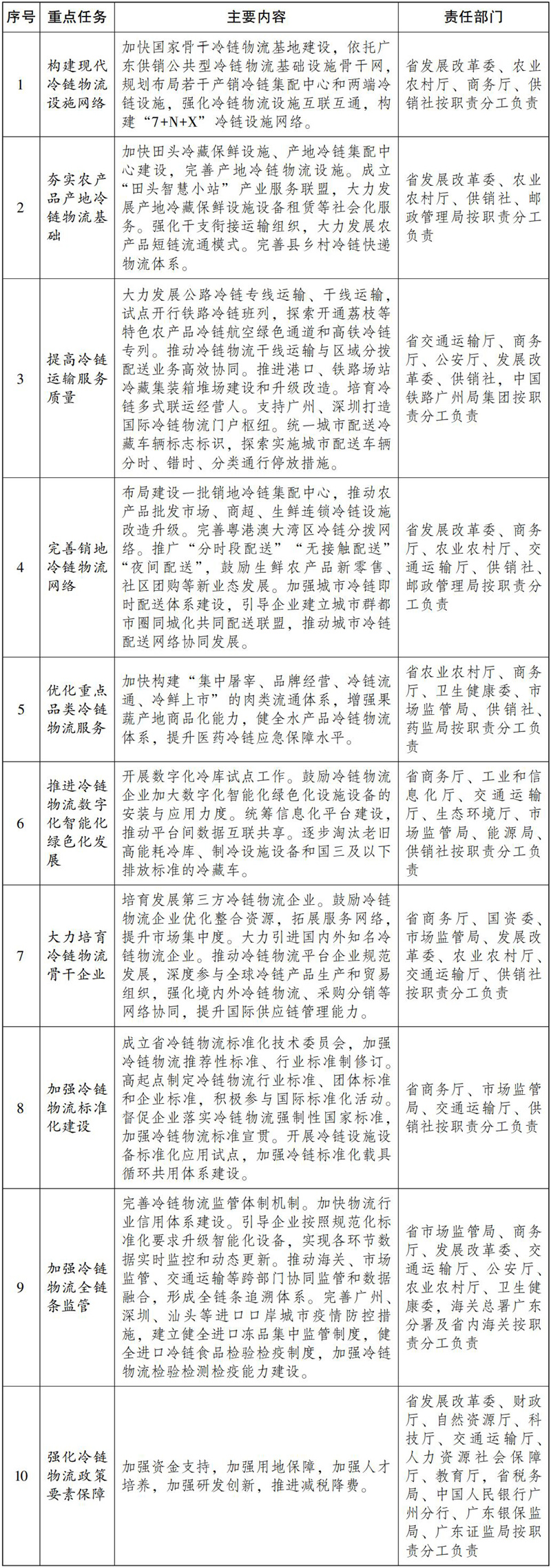 (二)加快冷链物流重要节点设施建设。支持广州、深圳、汕头、江门、湛江、茂名做好国家骨干冷链物流基地建设和申报工作,支持多个承载城市以联合体形式在城市群内部或沿国家冷链物流骨干通道开展合作共建。推进全省产销冷链集配中心布局建设工作,积极鼓励具备条件的产销冷链集配中心城市申请纳入国家骨干冷链物流基地承载城市。引导国家物流枢纽强化冷链物流设施建设。聚焦“最先一公里”和“最后一公里”冷链物流设施短板,加强两端冷链物流设施建设。