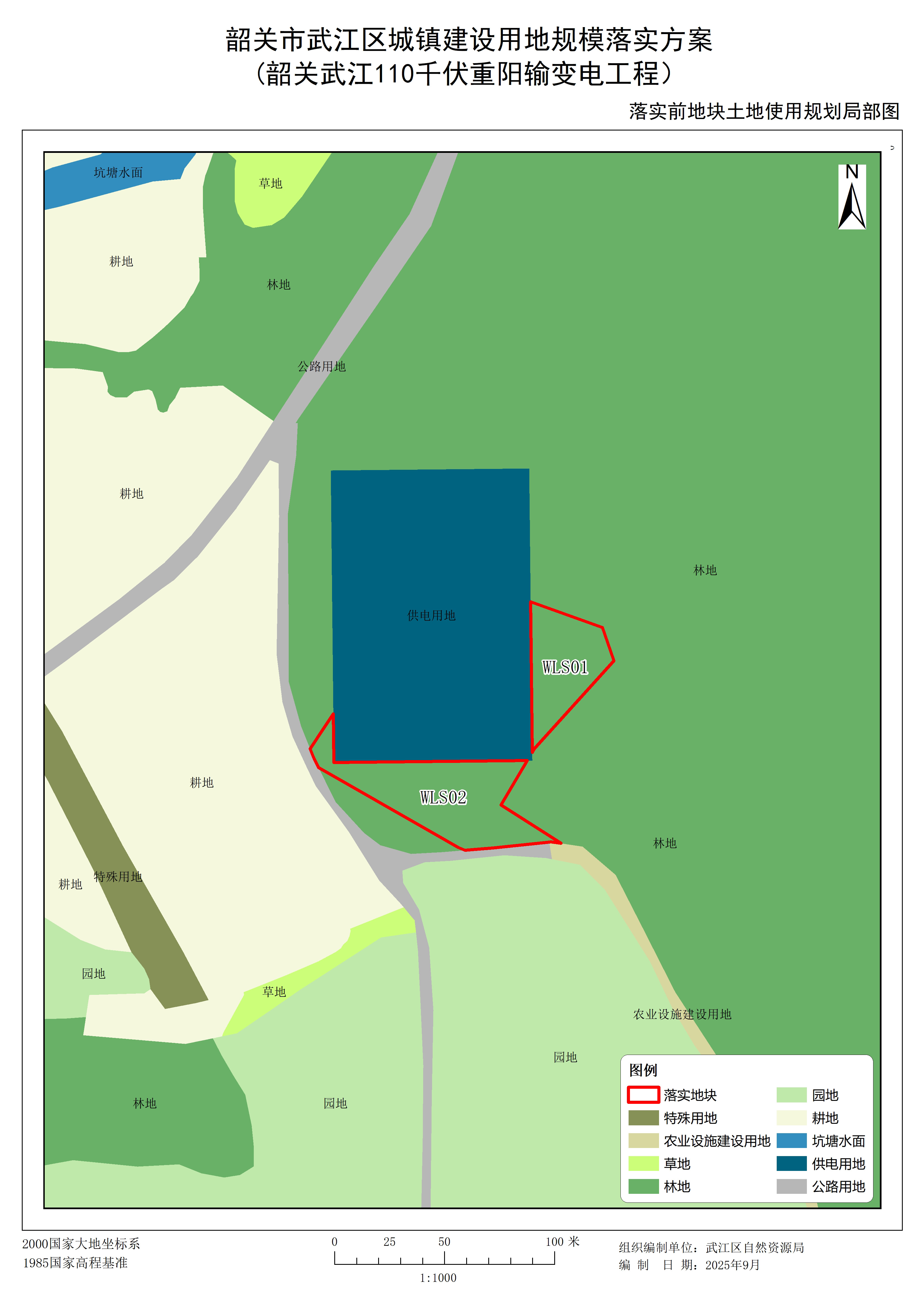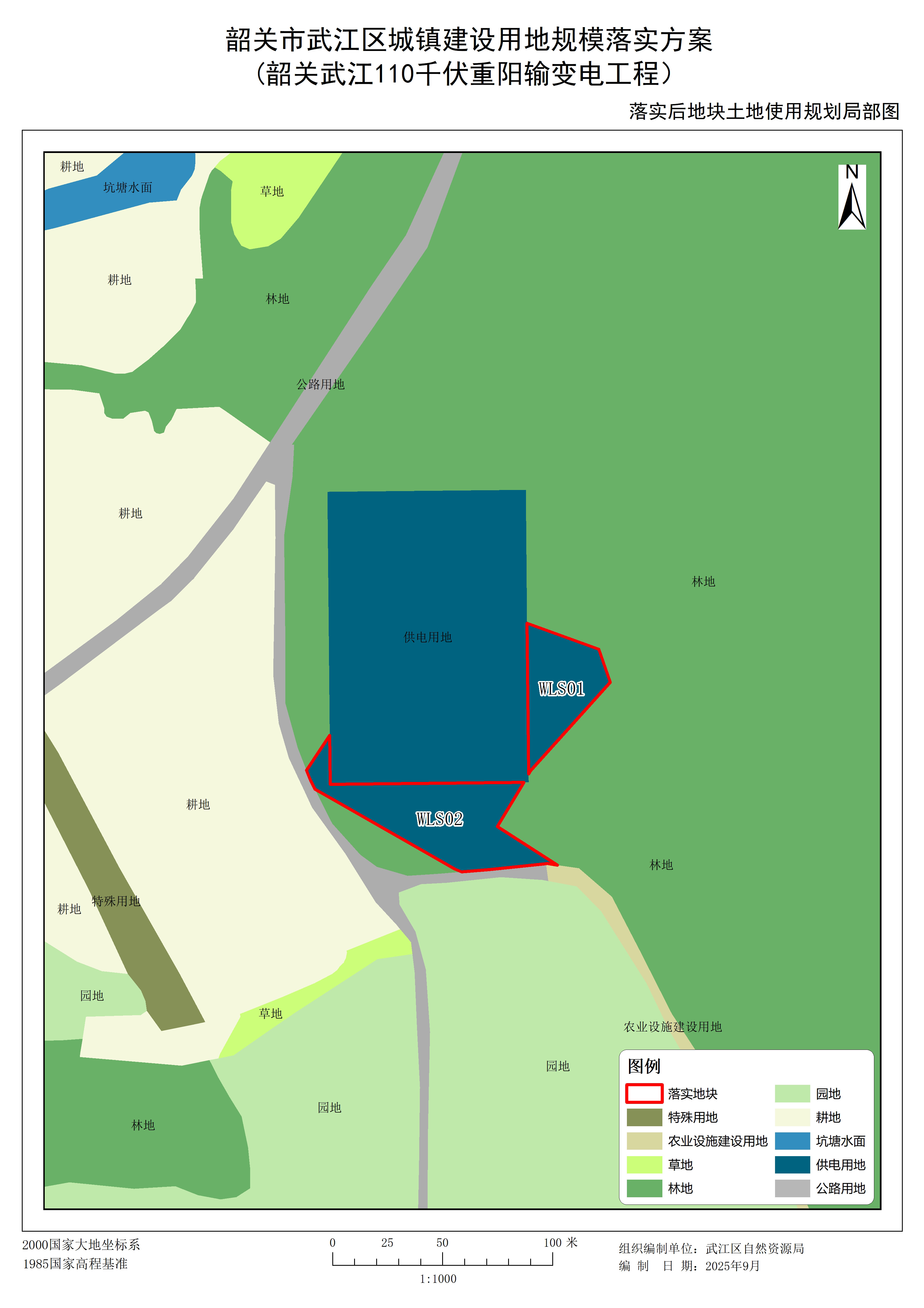 本项目涉及两个落实地块,分别为WLS01、WLS02,总面积为0.4091公顷。根据武江区2023年度国土变更调查成果,落实地块全部为农用地0.4091公顷(全部为乔木林地);规模落实前,根据武江区国土空间总体规划数据库,其规划用途为农用地0.4091公顷(全部为林地),规划分区为林业发展区0.4091公顷。规模落实后,其规划地类全部调整为城镇用地(供电用地),规划分区调整为综合服务区0.4091公顷。因此,城镇建设用地规模落实后,农用地减少0.4091公顷,城镇用地增加0.4091公顷;林业发展区减少0.4091公顷,综合服务区增加0.4091公顷。